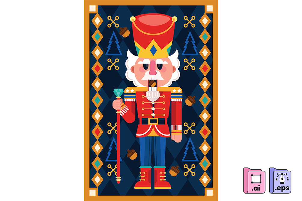 This charming flat-style Nutcracker illustration captures the timeless magic of the holiday season with bold colors, clean shapes, and decorative elements. Perfect for Christmas cards, posters, gift wrap, and festive branding projects.